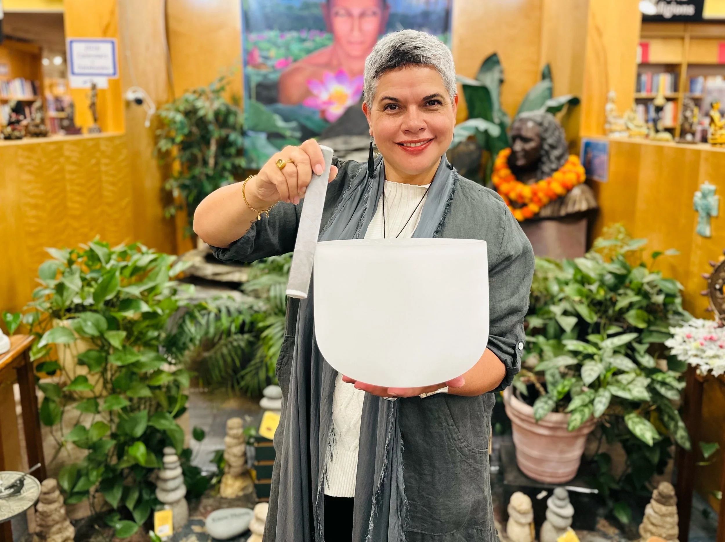 Julie Kalua is a sound practitioner, educator, and buyer for East West Bookshop’s singing bowl department. With years of experience selecting and working with bowls, she brings a finely attuned ear for tone, resonance, and subtle shifts in the nervous system developed through direct practice and community offerings.